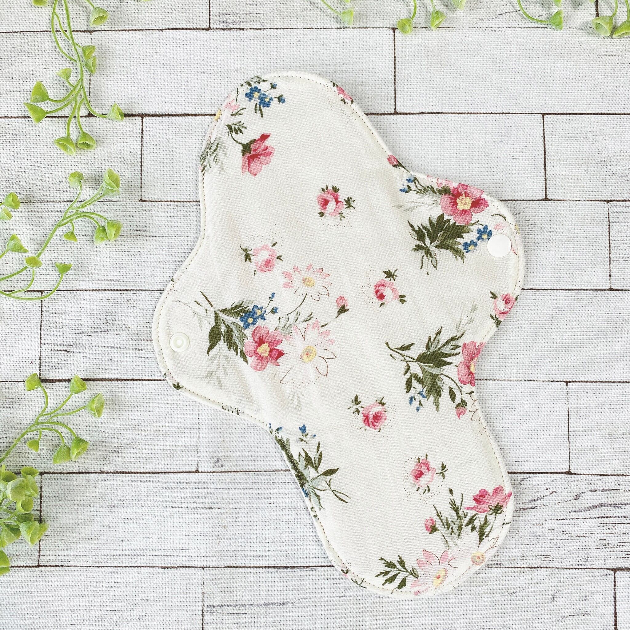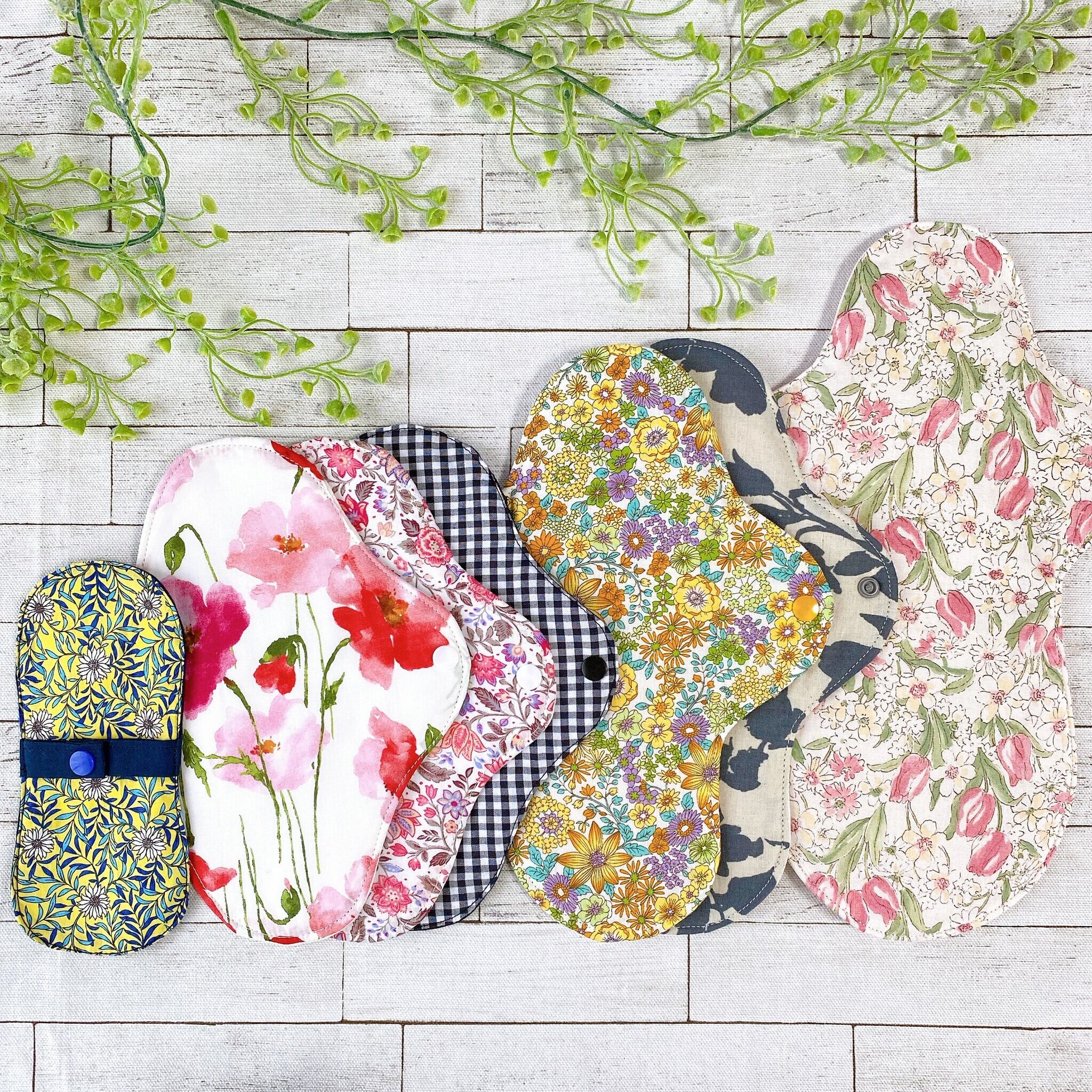 ✔布ナプキンMサイズ(防水布入り)縦24cm弱、肌面は国産綿100%ダブルガーゼ、生地間には全面にノーホルマリンネル1枚、吸収体ネル2枚、透湿防水布、肌着面は国産綿100%柄布の6枚重ね×2枚