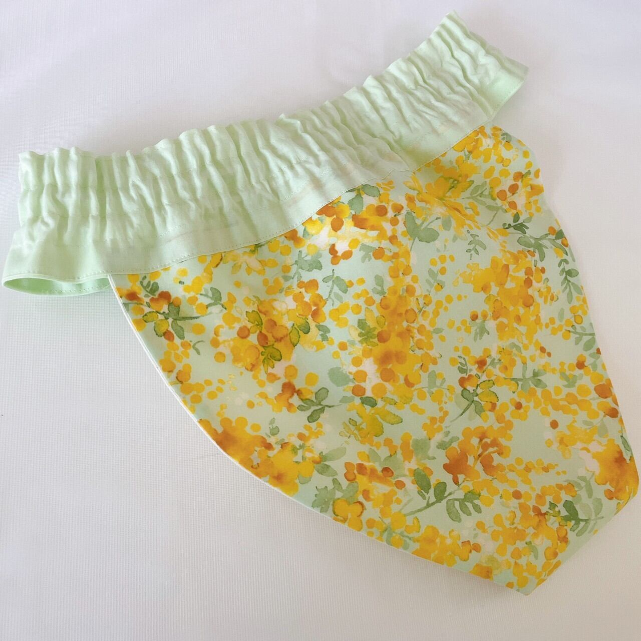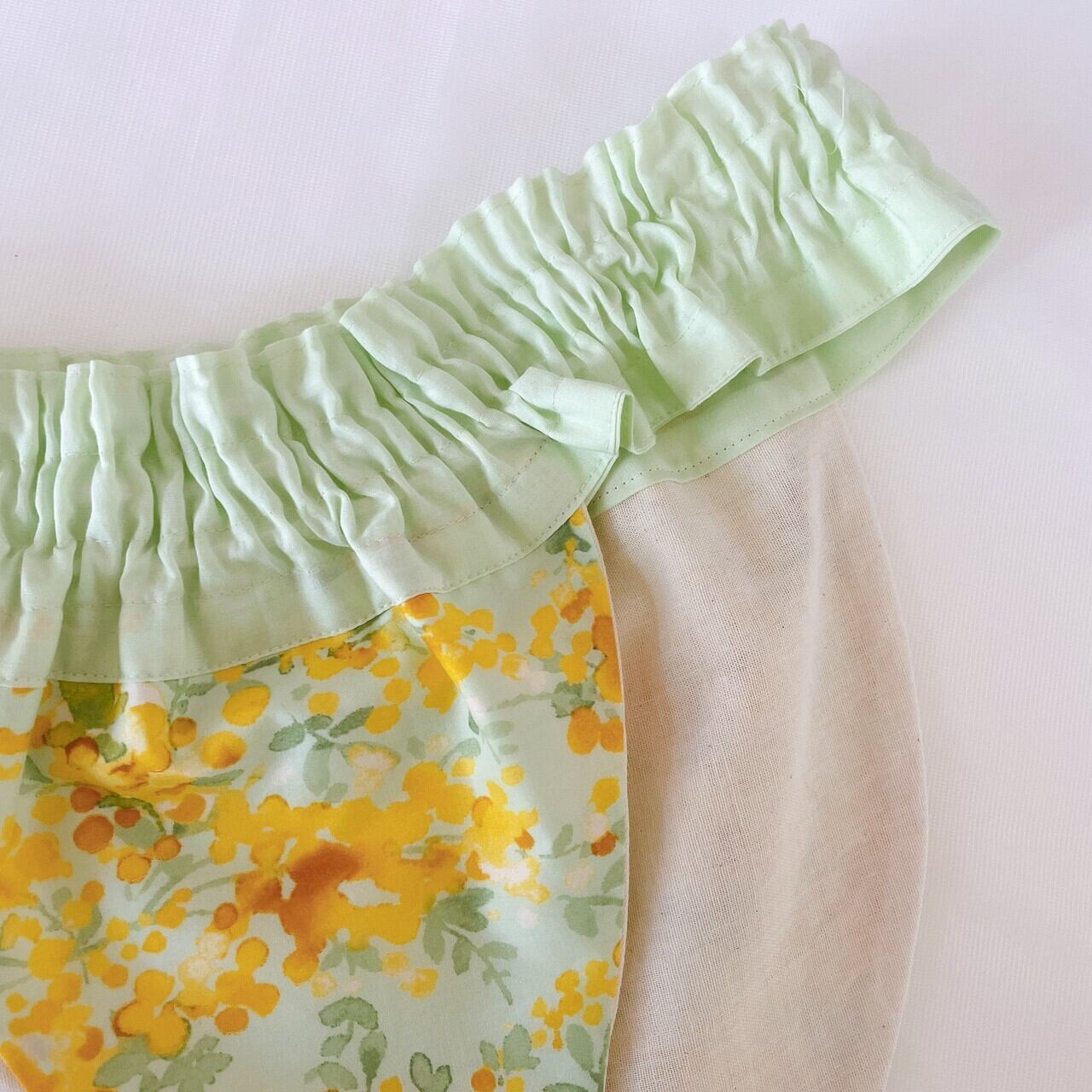 さらりとした薄手の綿ローン生地に気持ち華やぐミモザの柄をプリントされています。