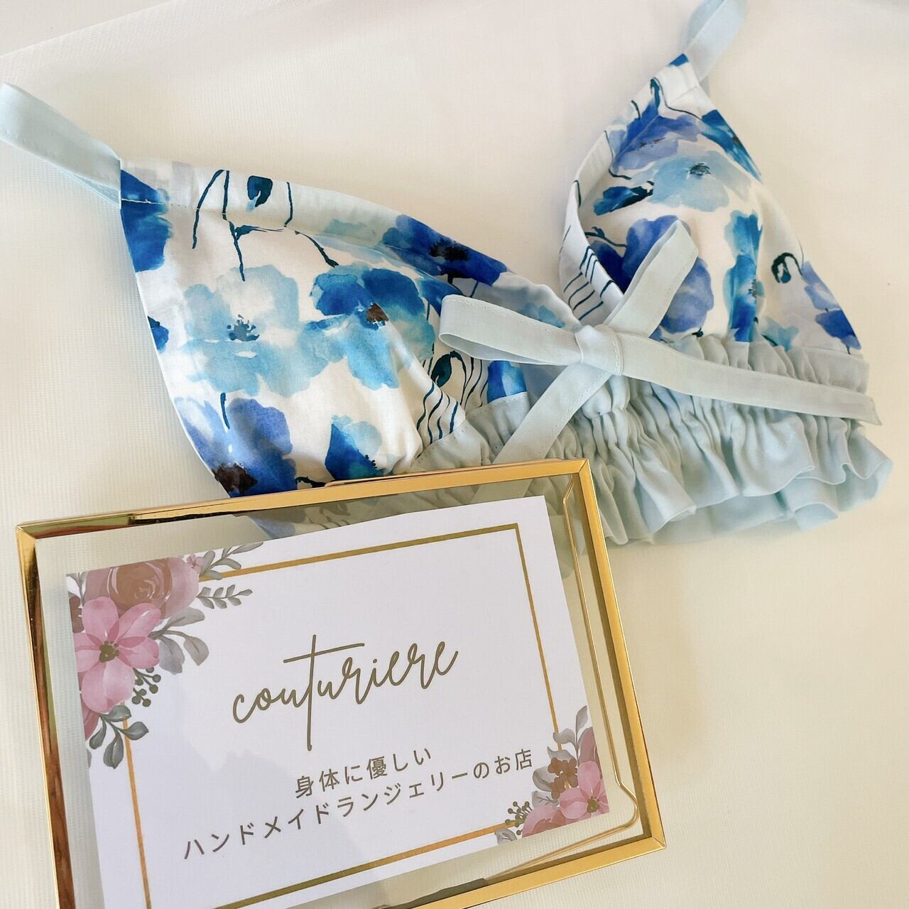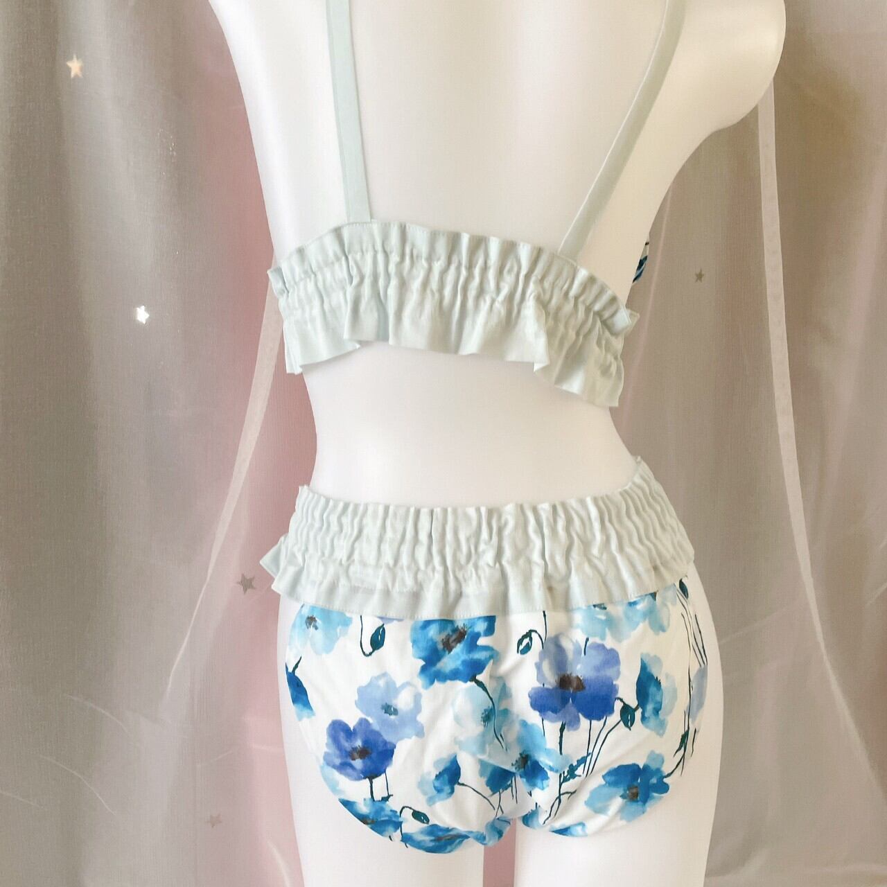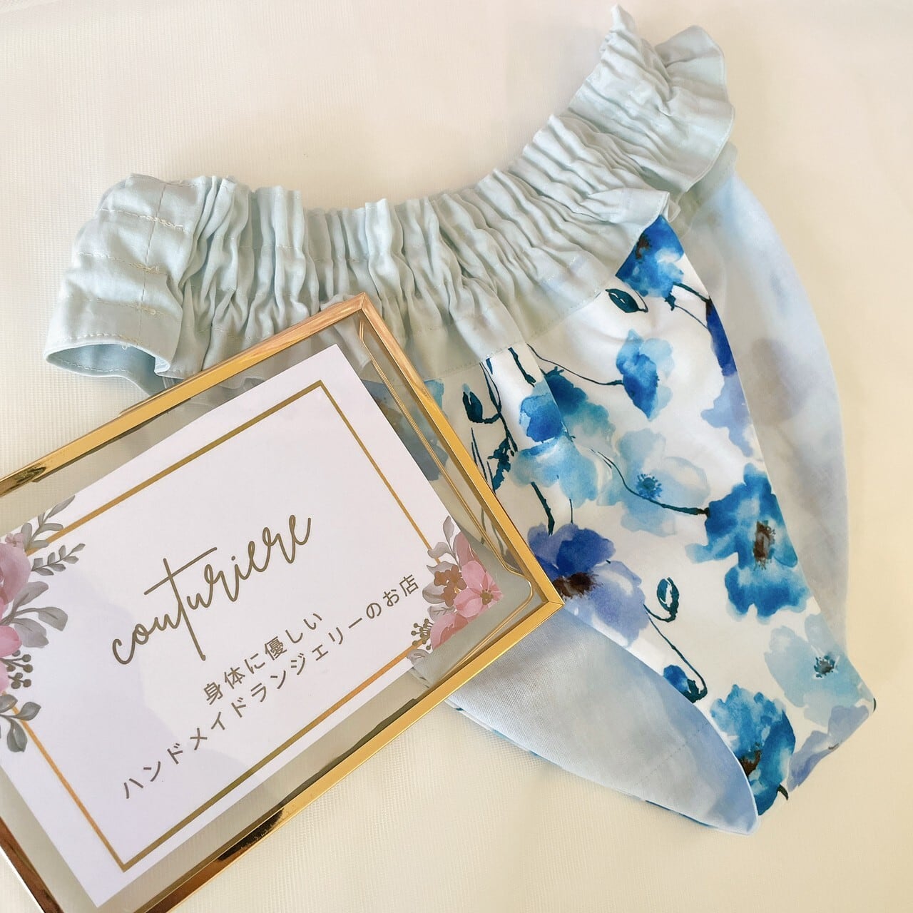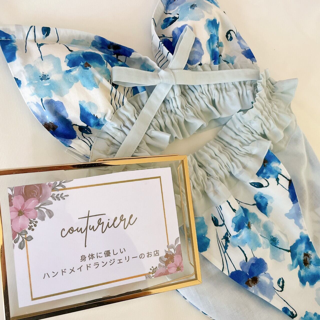 《 涼やかな窓辺から見た景色 水彩ポピー青*:・゚✧》締め付けない下着 リラックスブラジャー&ルナふんどしパンツセット | mint by couturiere*ストレスフリーなふんどしパンツのお店*