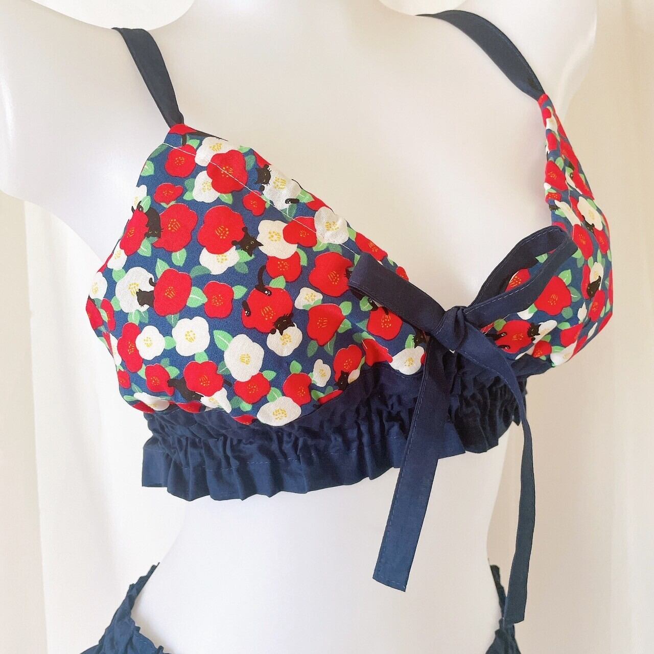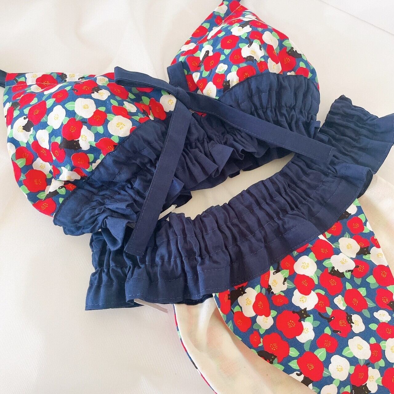チ明先生とのコラボに際し、私は椿と猫、配色にどこかジャポニズムを感じるレトロな生地をセレクトしました。
