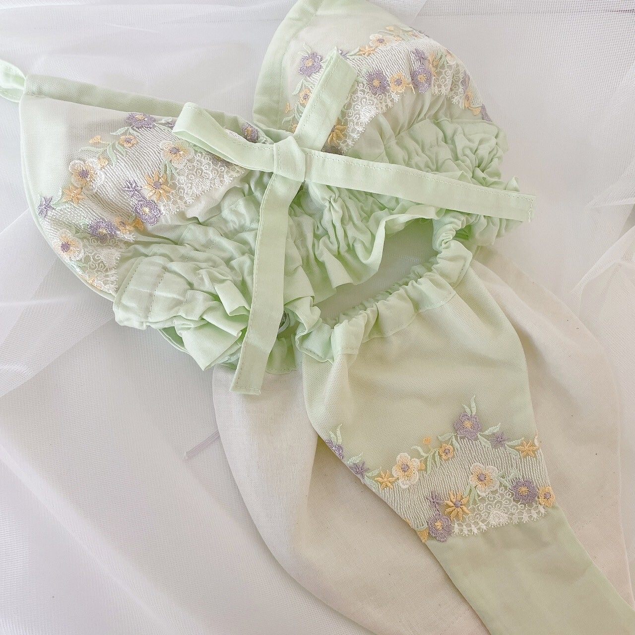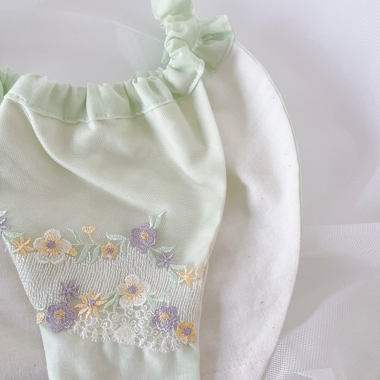 淡いグリーンに繊細な小花のレースを施し