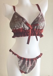 深いワインレッドのローン生地に可憐な花柄のレースを施しました。