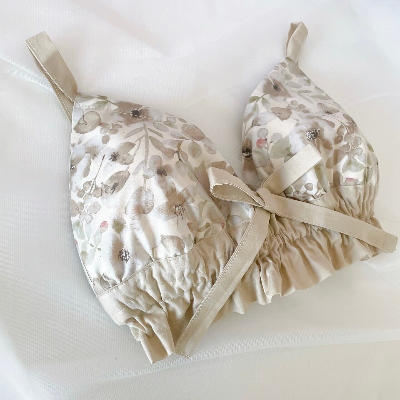 素肌にすっと馴染むようなベージュカラーリングの花柄生地です。