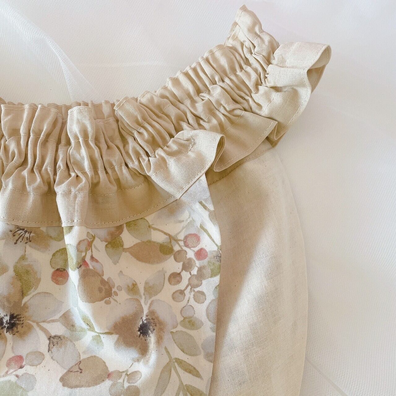 素肌にすっと馴染むようなベージュカラーリングの花柄生地です。